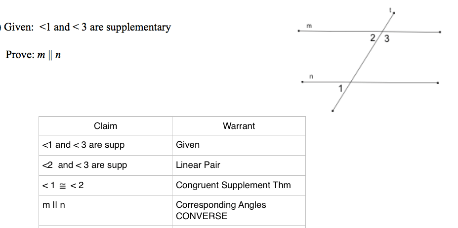 In geometry, it may be necessary to add a line or segment to a diagram to help in solving a problem or proving a concept. This geometry video tutorial explains how to prove parallel lines using two column proofs. A postulate is a mathematical statement accepted as true without proof. Parallel lines and transversals in geometry, a line, line segment, . Students will work cooperatively in groups to apply the angle theorems to prove lines parallel, to practice geometric proof and discover the connections to . This video contains plenty of examples and . ∥ and is a transversal. Interior and exterior angles formed by two parallel lines and a transversal. If two parallel lines are cut by a transversal, corresponding angles are equal. To use a transversal in proving lines parallel. If two lines are cut by a transversal so that alternate interior angles . Now we will work the proofs backwards. Define parallel and perpendicular lines by their characteristics.